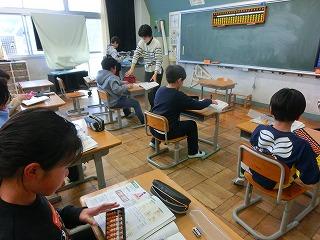 3年生が算数で「そろばん」の学習をしました。そろばんで数字を読んだり、おいたりして楽しんで学習しました。そろばんをはらう音が教室に響いていました。