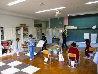1年生 2年生 体育 運動をして体をほぐした後、協力してマット運動ができるようにマットを運びました。