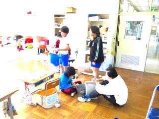 1年生 4年生 1年生が、あさがおのつるを鉢から取り外す作業をしました。4年生が作業を手伝いました。