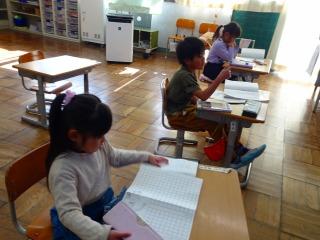 本を使って調べたことをもとに、クレーン車の「しごと」と「つくり」について文章を書いています。いろいろな車の「しごと」と「つくり」について学習してきたことを生かして、一人一人自分の言葉で表現することができました。