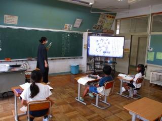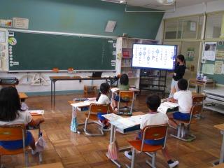 2年生 国語 ことば遊びの学習で、文にかくれていることばを見つけた人は体を乗り出して発表しました。