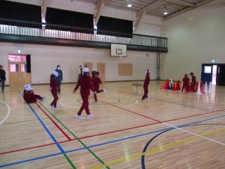 3年生 4年生 体育 コースを設置してチームで競う運動をしました。