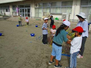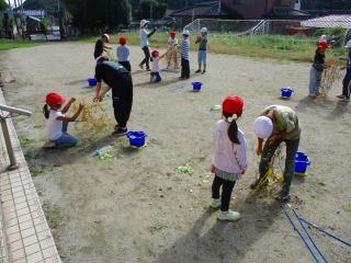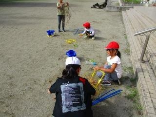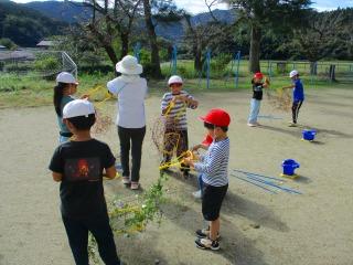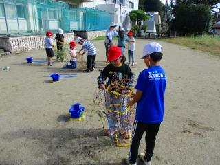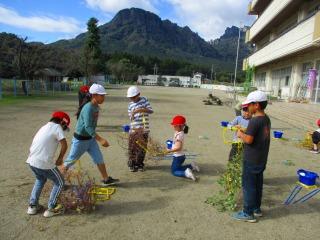 1年生 4年生 1年生が、あさがおのつるを鉢から取り外す作業をしました。4年生が作業を手伝いました。