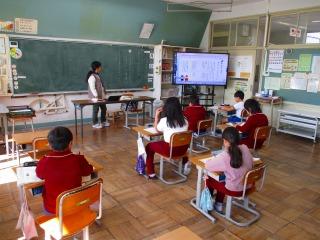 5年生 外国語 リズムに乗って英語であいさつしたり、質問に答えたりしました。