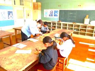 3年生 図工 木の工作に向けて、金槌を使って釘を打つ練習をしました。