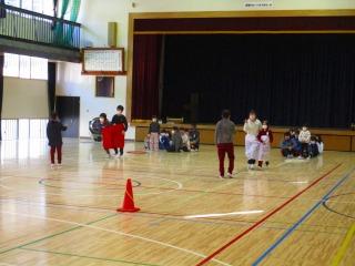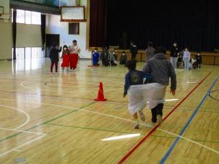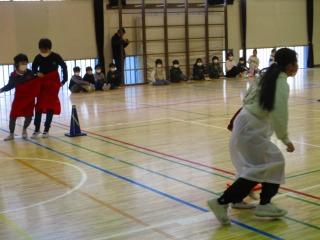 1年生と2年生は『デカパンじゃんけんリレー』で6年生と交流しました。