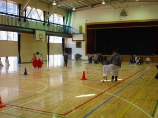 6チーム対抗で、足じゃんけんとなぞなぞを交互に行い、チームのコーンを陣に置きました。