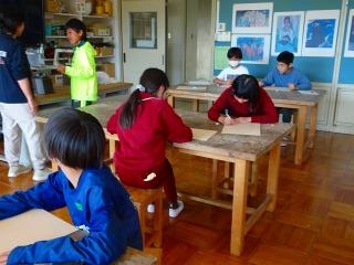 鳥獣戯画を見ながら、そこから見えてくる物語を想像して文章にしています。真剣に見つめているこの鳥獣戯画は、担任が描いたものだそうです。生き生きとした様子が伝わってきます。